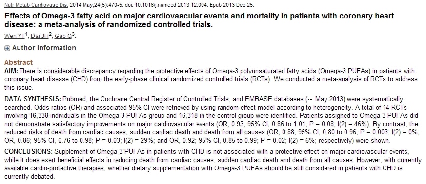 사용자 지정 1   오메가 3 지방산은 심혈관 질환의 예방과는 관계 없다는 최신 메타분석입니다. 음식으로 오메가 3 지방산을 이러한 질병의 예방을 할 수 있을 것인가에 대한 문제는 여전히 논란이 있는 문제입니다. Atheroscler Suppl. 2013 Aug;14(2):243-51. doi: 10.1016/S1567-5688(13)70005-9. Long-term effect of high dose omega-3 fatty acid supplementation for secondary prevention of cardiovascular outcomes: A meta-analysis of randomized, placebo controlled trials [corrected]. 위 연구에서는 오메가 3 지방산을 약품으로 고용량을 투여했을 경우 심혈관 질환의 예방 효과가 있다는 결론을 보였습니다. 그렇다고 음식물의 오메가 3 지방산이 같은 효과를 보인다고 볼 수 없을 뿐더러 지속적으로 같은 음식만 먹었을 경우 영양소의 불균형이 있을 수 있겠습니다.   또 다른 기사 내용입니다. “그밖에도 고등어 속 비타민D는 행복감을 조절하는 신경전달물질인 세로토닌 수치를 높여 계절성 우울증 예방에 효능을 보인다.” 계절성 우울증은 햇볓의 양이 극도로 적어지는 북반구 지역에서 주로 발생하는 질병입니다. 물론 국내에서도 통계는 없지만 어느정도의 환자는 있는것으로 되어 있습니다. 세로토닌이 계절성 우울증과 관련이 있다는 이론은 있지만 여전히 논란중인 문제입니다. 비타민 D는 계절성 우울증이 주로 태양광선을 쬐는 시간이 적어지기 때문에 체내에서 활성화 되는 비타민 D의 양이 적어지기 때문에 나온 이야기 이며 실제로 비타민 D와 계절성 우울증에 대한 연관성을 조사한 연구에서는 둘 사이에 관련이 없다는 결론을 내린 바 있습니다.