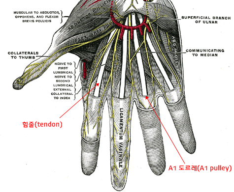 수술은 증상이 있는 손가락 힘줄 부위에 염증을 물리적으로 없애거나 결절을 제거하거나 A1 도르래를 절개하는 방식으로 시행합니다. 보통은 만성적인 환자에서 수술을 시행하므로 수술적 방법으로는 노화에 의해 두꺼워진 A1 도르래를 절개하는 경우가 가장 많습니다.