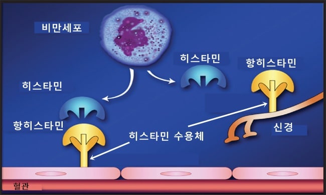 이러한 약들 중 우리들을 졸리게 하는 약은 바로 콧물을 줄이기 위해 사용하는 ‘항히스타민제(Antihistamines)’입니다. 항히스타민제란 말 그대로 ‘히스타민(Histamine)’이 작용을 제대로 못하도록 막는 약물인데요, 그렇다면 히스타민이라는 녀석이 우리 몸에서 어떤 일을 하는지에 대해 알아보도록 하겠습니다.