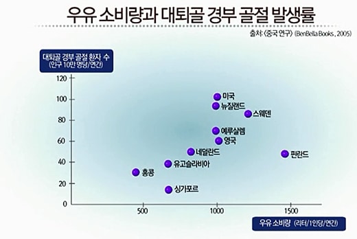 우유를 많이 소비하는 나라일수록 경부골절 환자수가 많다는 것을 보여주는 도표입니다.