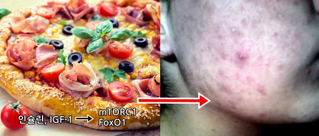 이를 포함한 여러 연구들은 고혈당 식이에서 발생한 인슐린, IGF-1등이 mTORC1, FoxO1등의 기전과 연관되어 여드름의 발생 원인인 피지의 과다 발생, 모낭 표피세포의 과증식 및 과각화, 염증에 영향을 미친다고 보고하였습니다.