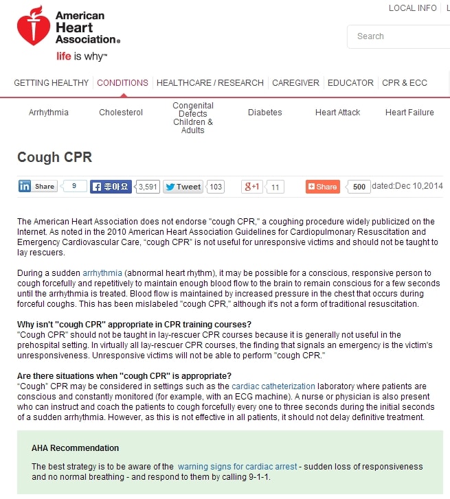 이 자료를 본다면 누구나 그럴것이라고 생각할 것이고 생명과 직결될 수 있는 중요한 이 자료를 마지막 그림과 같이 자신이 소중하게 여기는 지인이나 가족에게 공유하려고 할 것입니다. 하지만 위의 자료는 잘못된 자료입니다. 미국심장학회(AHA)는 2010년부터 위의 기침 CPR(심폐소생술) 방법을 더이상 권장하고 있지 않습니다.