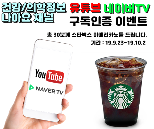 백세시대에 도움이 되는 건강 정보를 제공하는 나아요에서 유튜브와 네이버 TV 채널을 개설했습니다. 채널 개설 기념으로 추첨을 통해 총 30분께 스타벅스 아메리카노를 증정해 드립니다.